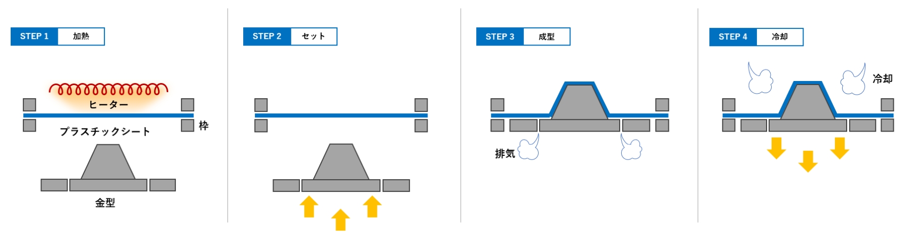 工程としては、大きく分けて4つのステップがあります。① シートをヒーターで加熱する → ② シートをセットする → ③ シートを金型に密着させて真空で成型する → ④ 冷却して取り出す、という流れです。成型後は必要に応じて、余分な部分をカットしたり、穴をあけたりといった加工も行われます。